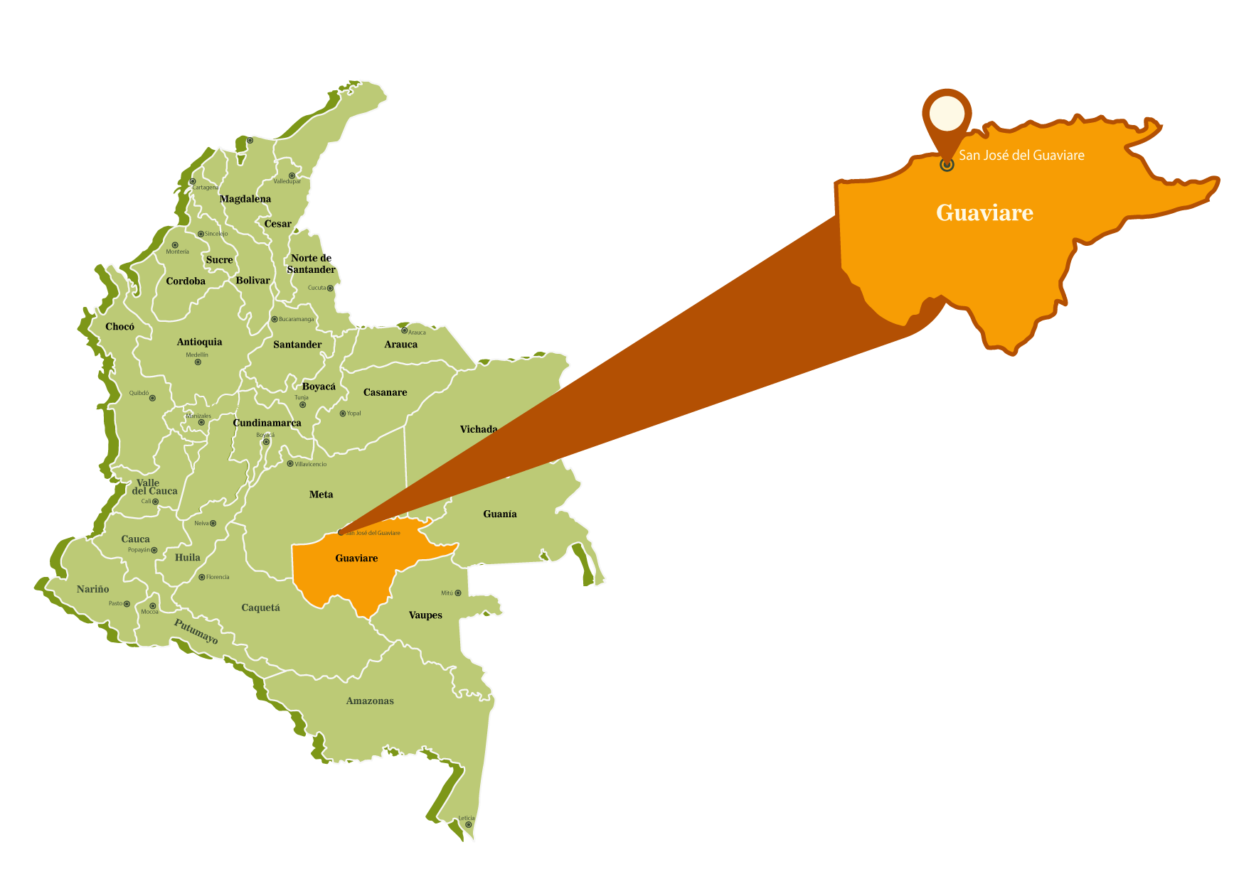 Localización: Ubicado al norte del Departamento del Guaviare en el límite entre la Orinoquía y la Amazonía, esta ciudad es un municipio joven, mezcla entre colonos e indígenas Jiw, Tucano Oriental y Nukak.
